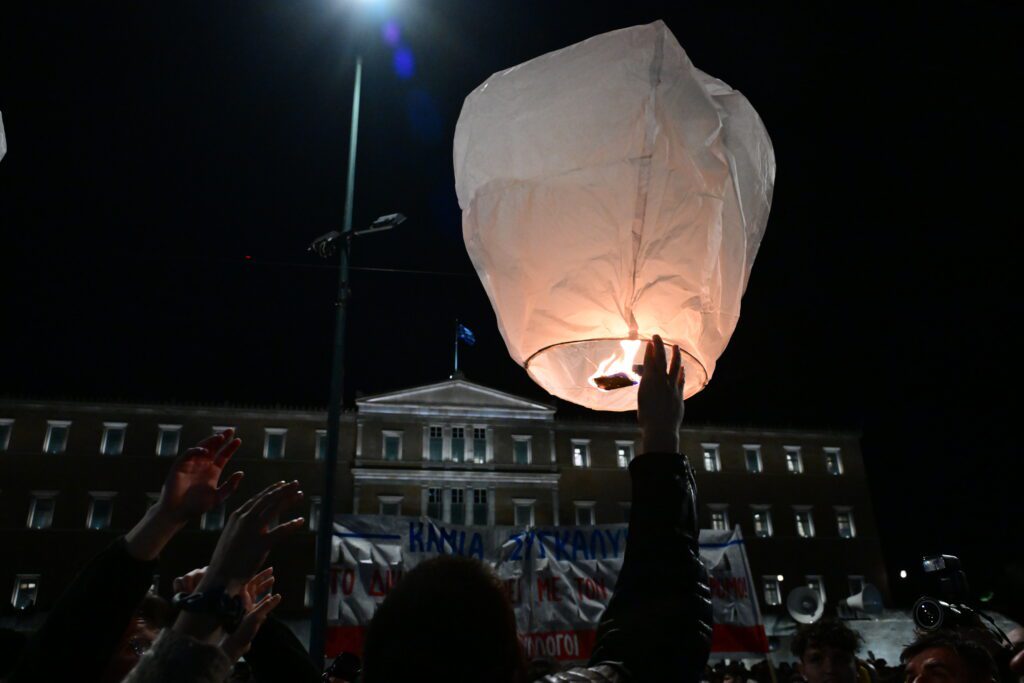 Έγκλημα Τέμπη: 57 φαναράκια για τα θύματα σήκωσαν στον ουρανό οι διαδηλωτές (Video)