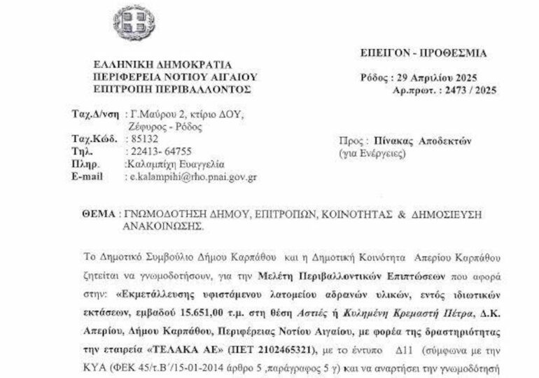 Το περιεχόμενο του εγγράφου είναι ιδιαιτέρως σοβαρό, καθώς σχετίζεται με τον Δήμαρχο Καρπάθου κ. Φελλουζή, ο οποίος, επί 26 χρόνια, επιδιώκει τη λήψη περιβαλλοντικής άδειας για τη λειτουργία λατομείου, χωρίς μέχρι σήμερα να έχει λάβει έγκριση από τις αρμόδιες αρχές.