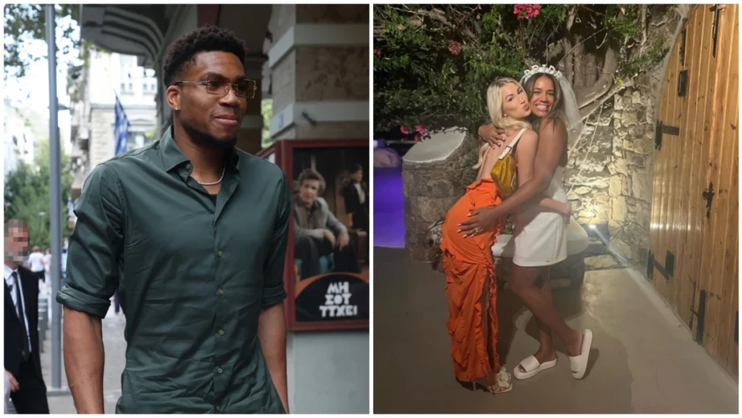 Σε άλλη φωτογραφία ο Γιάννης Αντετοκούνμπο βγάζει περιπαιχτικά την γλώσσα του την ώρα που πλαισιώνεται μεταξύ άλλων από τα αδέρφια του, τον κουμπάρο του Κρις Μίντλτον, τον Μπόμπι Πόρτις Τζούνιορ, τον Τζρου Χόλιντεϊ, τον Δημήτρη Αγραβάνη και τον Χρήστο Σαλούστρο.
