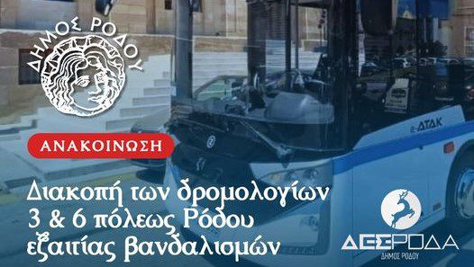 «Διακόπτονται τα δρομολόγια 3 & 6 πόλεως Ρόδου της δημοτικής συγκοινωνίας, έπειτα από βανδαλισμούς από ομάδα νεαρών σε λεωφορείο, που σημειώθηκαν νωρίτερα σήμερα.