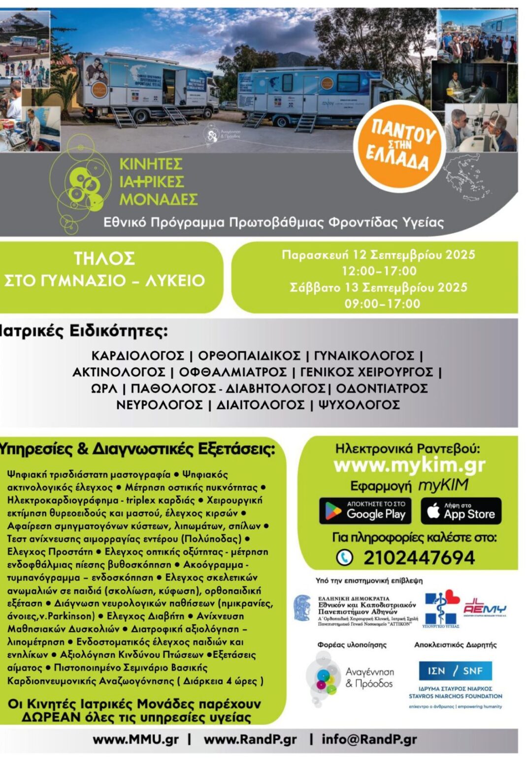 Δωρεάν Ιατρικές Εξετάσεις και Σεμινάριο ΚΑΡΠΑ στην Τήλο στις 12 & 13 Σεπτεμβρίου 2025 από την Κινητή Ιατρική Μονάδα