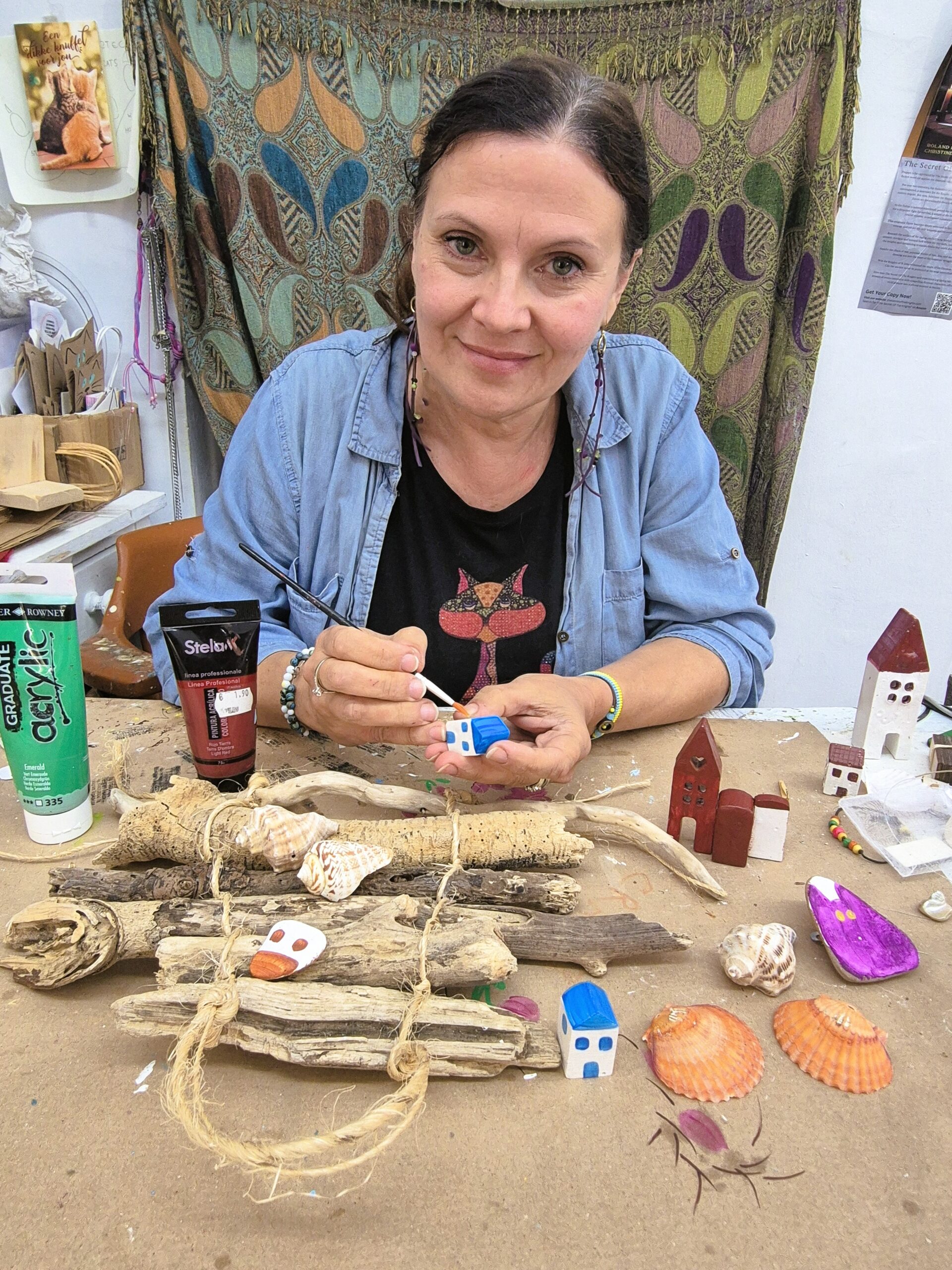 Μια βόλτα στο παλιό λιμάνι της Ρόδου κι εφοδιάζεται με κομμάτια κεραμικών από στάμνες που πετιόντουσαν στη θάλασσα ή ξύλα λιασμένα και ξεβρασμένα από το κύμα, ενώ από την παραλία της Αφάντου συλλέγει κοχύλια ή προμηθεύεται άλλα από τους ψαράδες. Ακόμη και οι βλαστοί αναρριχόμενων φυτών πλέκονται σε στεφανάκια που αναλόγως εποχής θα στολιστούν χριστουγεννιάτικα ή με κεραμικά. Σε θαλασσόξυλα προσαρμόζονται τριγωνικά πανιά και γίνονται πλεούμενα, κοχύλια κρέμονται από γιρλάντες με φωτάκια, βοτσαλάκια βάφονται για να στολίσουν κουτιά και διακοσμητικά με νησιώτικα σπιτάκια, πέτρες ζωγραφίζονται και σανίδες πλαισιώνουν κάδρα με χειροποίητες φυσικά συνθέσεις. Ακόμη και κεραμικές βάσεις για γλάστρες μεταμορφώνονται σε ζωγραφιστά ματάκια καλοτυχίας.