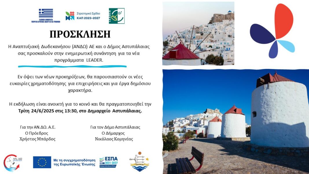 Η Αναπτυξιακή Δωδεκανήσου (ΑΝΔΩ) ΑΕ και ο Δήμος Αστυπάλαιας διοργανώνουν ενημερωτική συνάντηση για τα νέα προγράμματα LEADER. Ενόψει των νέων προκηρύξεων, θα παρουσιαστούν οι νέες ευκαιρίες χρηματοδότησης για επιχειρήσεις και για έργα δημόσιου χαρακτήρα.