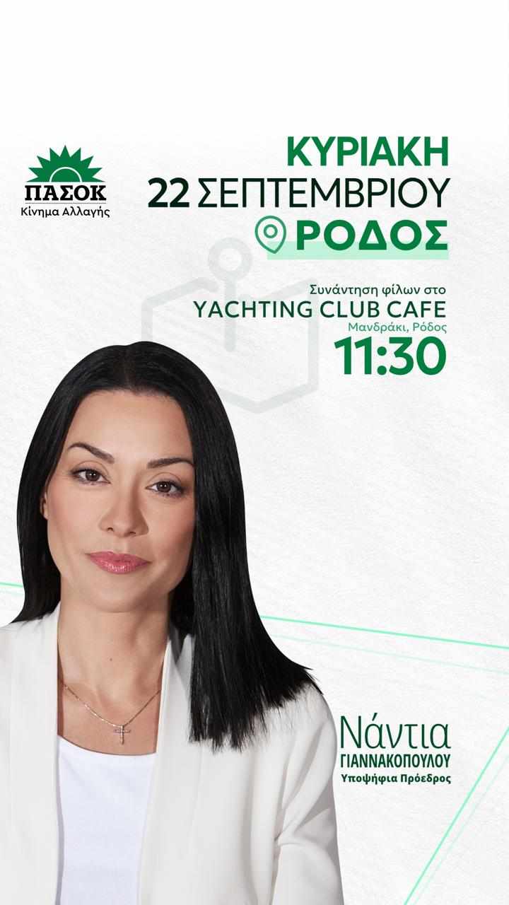 «Την Κυριακή 22 Σεπτεμβρίου 2024 θα βρίσκεται στη Ρόδο η Βουλευτής και υποψήφια Πρόεδρος του ΠΑΣΟΚ Νάντια Γιαννακοπούλου στο πλαίσιο των εσωκομματικών εκλογών της 6ης Οκτωβρίου για να κουβεντιάσει με τους πολίτες.