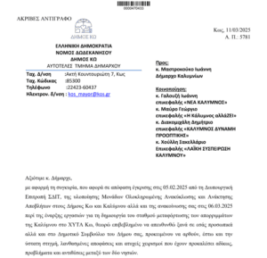 Το Αυτοτελές Τμήμα του Δημάρχου Κω, Θεοδόση Νικηταρά, έδωσε στη δημοσιότητα την επιστολή που απέστειλε προς τον Δήμαρχο Καλυμνίων, Ιωάννη Μαστροκούκο, με κοινοποίηση στους επικεφαλής των δημοτικών παρατάξεων της Καλύμνου.