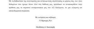 Στην κατακλείδα της επιστολής, ο κ. Νικηταράς δηλώνει: