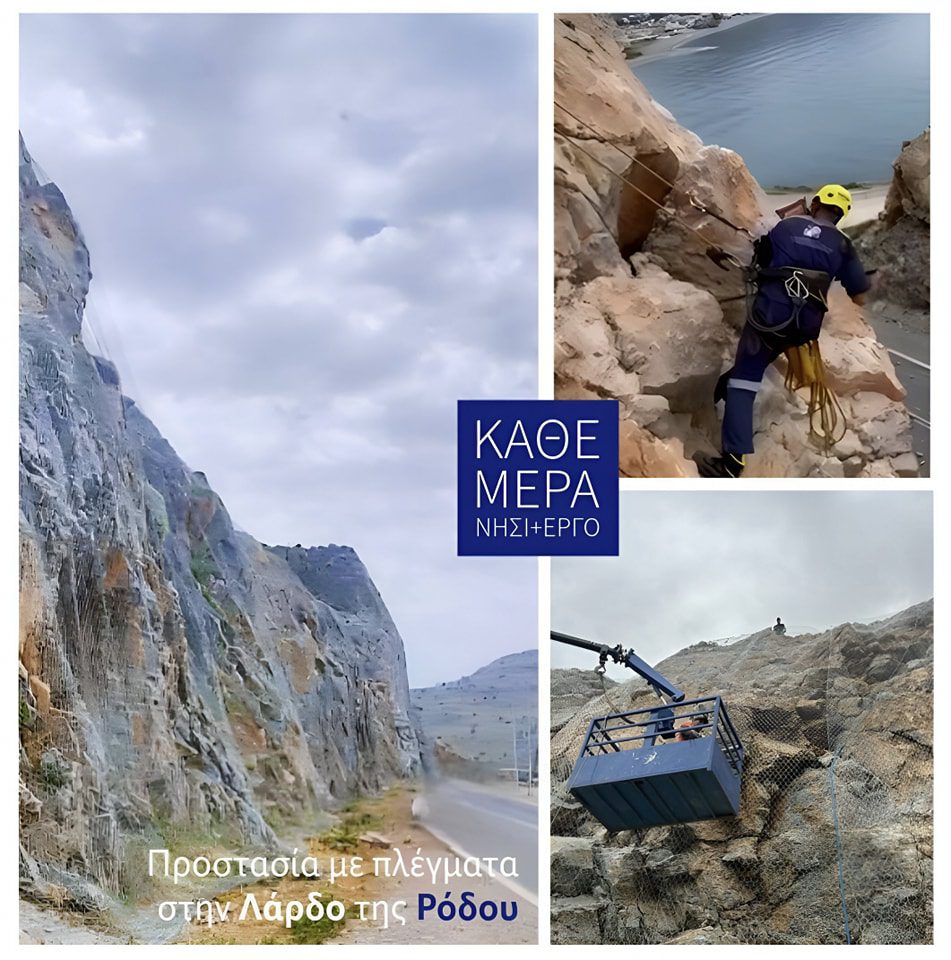 “Μετά την δουλειά των αναρριχητών, δύο ακόμα συνεργεία προχώρησαν στην αγκύρωση και τοποθέτηση ειδικών πλεγμάτων συγκράτησης των βράχων. Σε όλο το νησί της Ρόδου, τα μέτωπα στα οποία ήδη δουλεύαμε ήταν πολλά αλλά έγιναν πολύ περισσότερα με το πέρασμα της κακοκαιρίας Bora. Δεν σταματήσαμε ούτε ημέρα και σε όλα τα εργοτάξια, ήρθε ημέρα που ήταν 25 τα εργοτάξια που δούλευαν ταυτόχρονα, υπάρχει πρόοδος, υπάρχει αποτέλεσμα.”