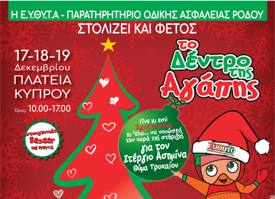 Για ένα σκοπό… για ένα καλό… το «Δέντρο της Αγάπης». Θεσμός για τη Ρόδο. Μια πανελλαδική δράση που ξεκίνησε το 2009, στολίζοντας το πρώτο «Δέντρο της Αγάπης» στην πλατεία Δημαρχείου για να στηρίξουμε το 2009 θύμα τροχαίου ηλικίας 17 χρόνων. Από τότε συνεχίσαμε και στηρίξαμε θύματα τροχαίων, μέλη οικογενειών θυμάτων που σίγουρα όλοι θα θυμάστε.