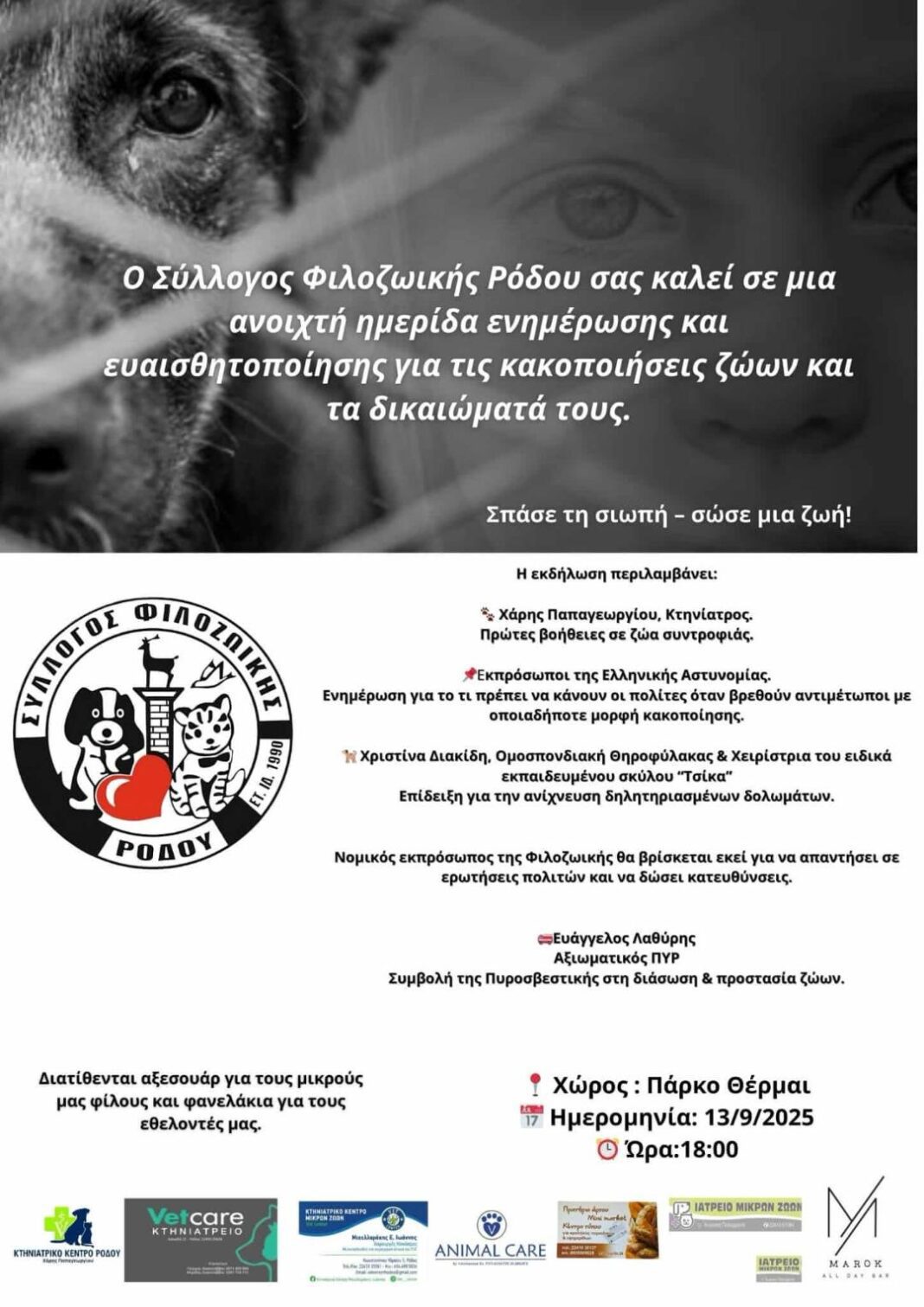 Ο Σύλλογος Φιλοζωικής Ρόδου διοργανώνει το Σάββατο, 13 Σεπτεμβρίου 2025 και ώρα 18:00, στο Πάρκο Θέρμαι, μια ανοιχτή ημερίδα ενημέρωσης και ευαισθητοποίησης με θέμα τις κακοποιήσεις ζώων και τα δικαιώματά τους.