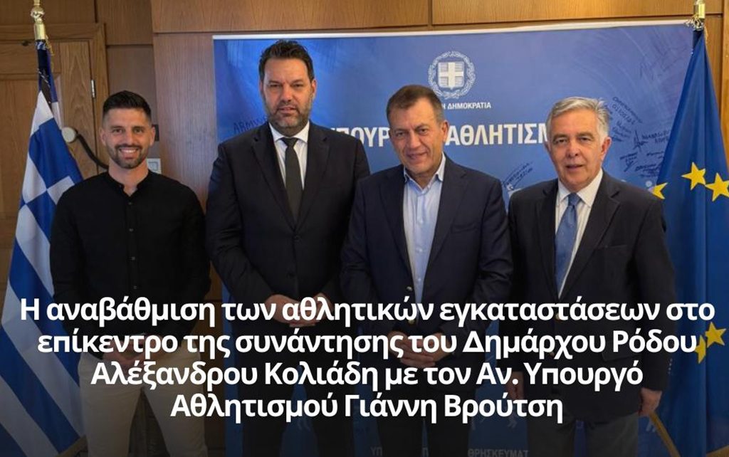 Με στόχο την ενίσχυση του Αθλητισμού και την αναβάθμιση των υποδομών της Ρόδου, ο Δήμαρχος Ρόδου, Αλέξανδρος Κολιάδης, είχε εποικοδομητική συνάντηση με τον Αναπληρωτή Υπουργό Αθλητισμού, Γιάννη Βρούτση, παρουσία του εντεταλμένου συμβούλου Αθλητισμού του Δήμου Ρόδου, Μιχάλη Πλύγκου και του Βουλευτή Δωδεκανήσου της Νέας Δημοκρατίας, Βασίλη Υψηλάντη.