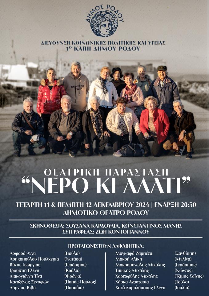 Η Θεατρική Ομάδα -Πήγασος- του 1ου Καπη Δ.Ρόδου παρουσιάζει, τη θεατρική παράσταση «Νερό και Αλάτι» με σκοπό τη στήριξη των πληγέντων από την πρόσφατη κακοκαιρία που έπληξε το νησί. Οι παραστάσεις θα πραγματοποιηθούν στις 11 και 12 Δεκεμβρίου 2024 στο Δημοτικό Θέατρο Ρόδου, με ώρα έναρξης στις 8:30 μ.μ. και ελεύθερη είσοδο.