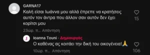 Ανάμεσα στα hate comments που δέχτηκε η influencer ήταν και ένα που της έγραψε: «Καλή είσαι Ιωάννα μου αλλά έπρεπε να κρατήσεις αυτόν τον άντρα που άλλον σαν αυτόν δεν έχει κορίτσι μου».