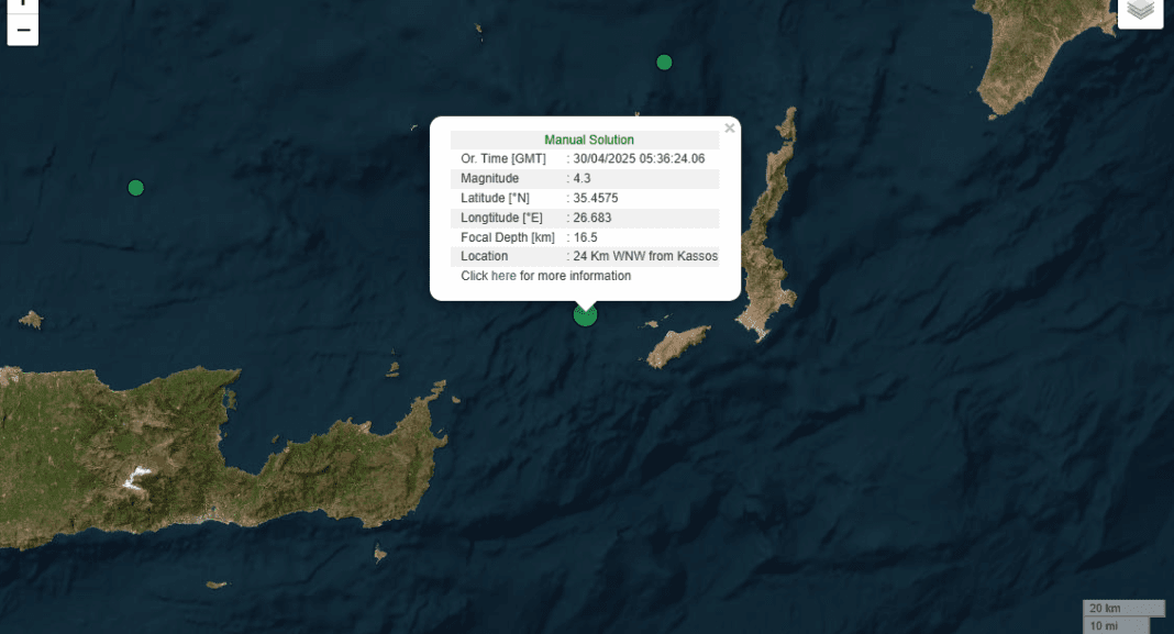 Σύμφωνα με το Γεωδυναμικό Ινστιτούτο του Εθνικού Αστεροσκοπείου Αθηνών, το επίκεντρο της δόνησης εντοπίζεται στον θαλάσσιο χώρο 24 χλμ. δυτικά-βορειοδυτικά της Κάσου.