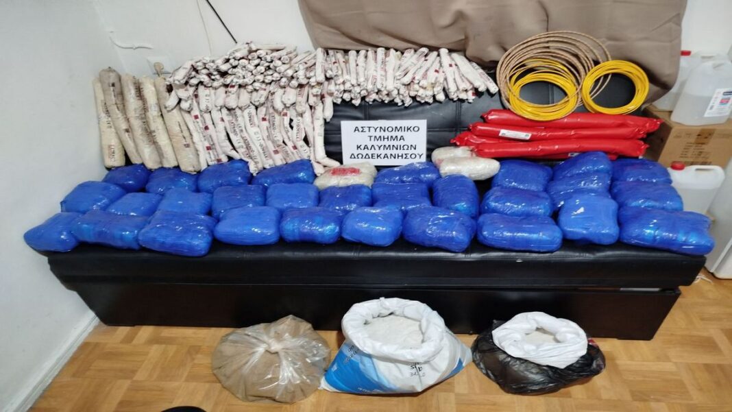 Στην Κάλυμνο βρέθηκαν και κατασχέθηκαν 45,8 κιλά εκρηκτικό γαλάκτωμα, 10 κιλά χημικό εκρηκτικό, 93 κιλά αυτοσχέδιων εκρηκτικών κατασκευών (δυναμίτες), 23 μέτρα βραδύκαυστο φυτίλι, 22.1 κιλά αμμωνίτη και 7,5 κιλά λίπασμα.