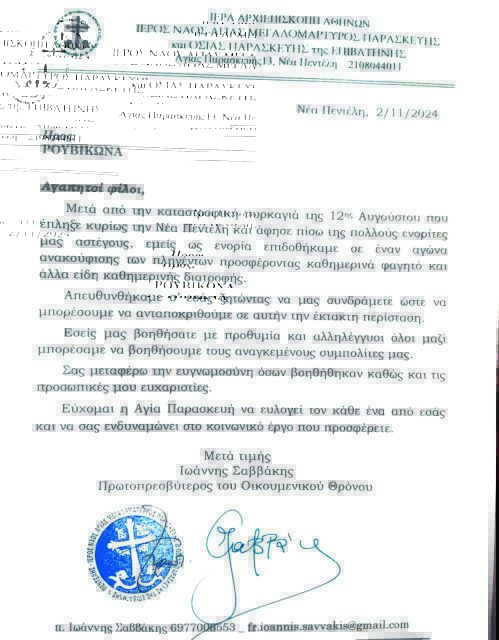 Το καλό είναι ότι σε αυτή τη χώρα δεν βαριόμαστε ποτέ. Εκεί που νομίζουμε ότι τα έχουμε δει όλα, κάτι έρχεται πάντα να μας διαψεύσει. Διαβάσαμε λοιπόν την επιστολή που έστειλε στον Ρουβίκωνα ο πατήρ Ιωάννης Σαββάκης, πρωτοπρεσβύτερος του Οικουμενικού Θρόνου, για λογαριασμό του Ιερού Ναού Αγίας Μεγαλομάρτυρος Παρασκευής και Οσίας Παρασκευής της Επιβατηνής στη Νέα Πεντέλη. Με την οποία ευχαριστεί τα μέλη της οργάνωσης για τη βοήθειά τους έπειτα από την καταστροφική πυρκαγιά της 12ης Αυγούστου. Ο π. Σαββάκης λέει, συγκεκριμένα, προς την οργάνωση: «Απευθυνθήκαμε σε εσάς ζητώντας να μας συνδράμετε ώστε να μπορέσουμε να ανταποκριθούμε σε αυτή την έκτακτη ανάγκη. Εσείς μας βοηθήσατε με προθυμία και αλληλέγγυοι όλοι μαζί μπορέσαμε να βοηθήσουμε τους αναγκεμένους συμπολίτες μας. Σας μεταφέρω την ευγνωμοσύνη όσων βοηθήθηκαν καθώς και τις προσωπικές μου ευχαριστίες. Εύχομαι η Αγία Παρασκευή να ευλογεί τον κάθε έναν από εσάς και να σας ενδυναμώσει στο κοινωνικό έργο που προσφέρετε».