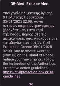 Μετά από πολλές ώρες καταστροφικής κακοκαιρίας που έχει ήδη μετατρέψει τους δρόμους της Ρόδου σε παγίδες θανάτου, το μήνυμα του 112 ήχησε μόλις τώρα, προκαλώντας οργή στους κατοίκους. Η καθυστερημένη ενεργοποίηση του συστήματος έγκαιρης προειδοποίησης φανερώνει την αποτυχία της κυβέρνησης και του Υπουργείου Πολιτικής Προστασίας να προστατεύσουν τους πολίτες.