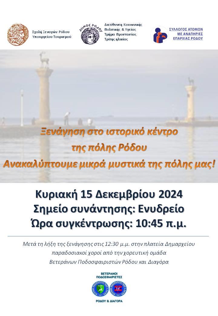 Το πρόγραμμα ξενάγησης με αφετηρία το Ενυδρείο (10:45πμ. ώρα συγκέντρωσης και 11:00 έναρξης), θα ακολουθήσει τη διαδρομή έως τα «Ελαφάκια» στο Μανδράκι και θα ολοκληρωθεί στην πλατεία Δημαρχείου Ρόδου. Μετά την ολοκλήρωση στις 12:30μμ θα ακολουθήσει παρουσίαση παραδοσιακών χορών από την χορευτική ομάδα των Βετεράνων Ποδοσφαιριστών ομάδων «Διαγόρα» και «Ρόδου».