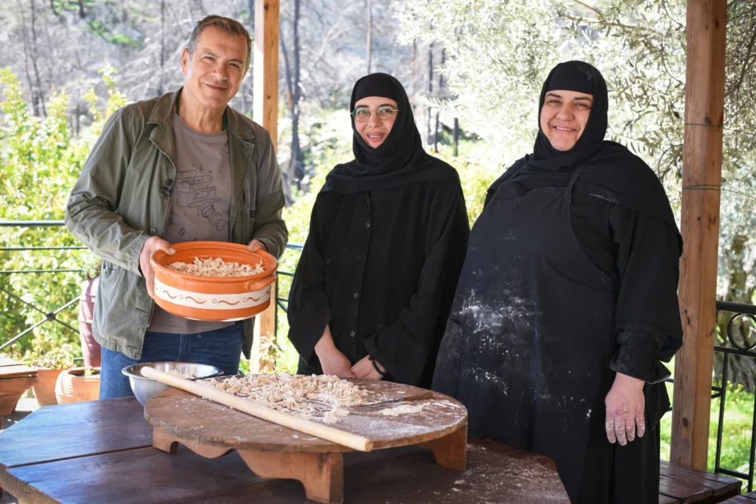 Ο Σταύρος Θεοδωράκης τις παρακολουθεί να παρασκευάζουν παραδοσιακό μάτσι, κηραλοιφές, λιβάνι και χρυσοκέντητα εκκλησιαστικά υφαντά.
