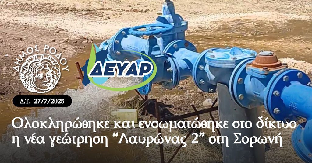 Ο Δήμος Ρόδου και η ΔΕΥΑΡ ολοκλήρωσαν μία ακόμη σημαντική παρέμβαση ενίσχυσης του υδρευτικού δικτύου, με την πλήρη ενσωμάτωση της νέας γεώτρησης “Λαυρώνας 2” στην Τοπική Κοινότητα Σορωνής.