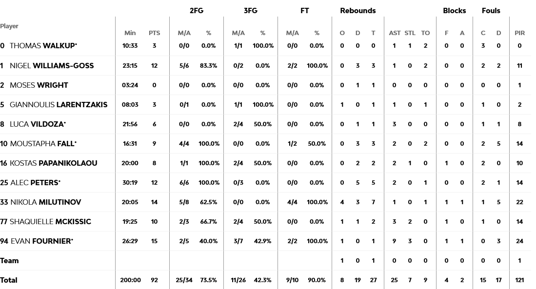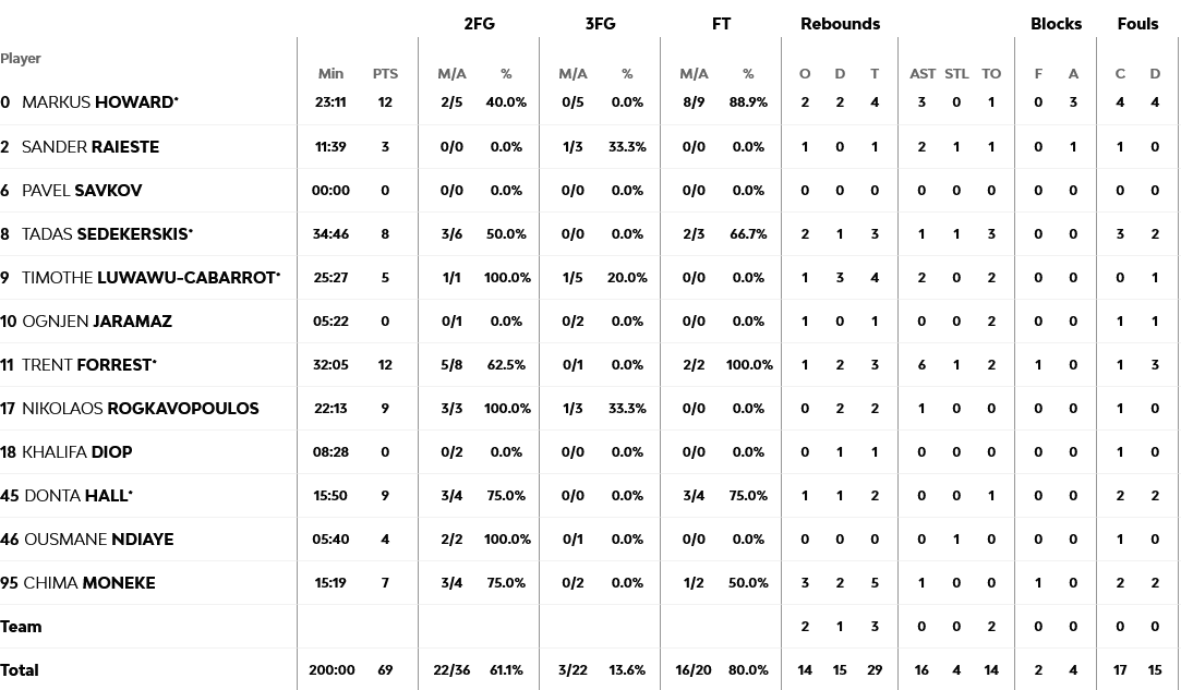 Ξεχώρισαν: Κυρίαρχος ο Μιλουτίνοβ με 14 πόντους και επτά ριμπάουντ, με τον Πίτερς να καλύπτει το κενό του Βεζένκοβ, με 12 πόντους. Για την Μπασκόνια, Φόρεστ και Χάουαρντ είχαν από 12 πόντους έκαστος.