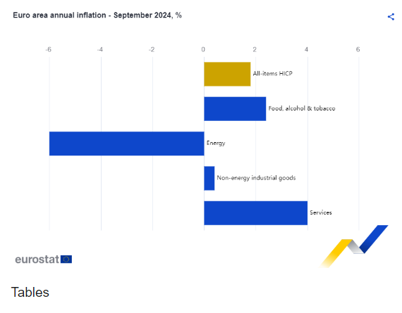 Όσον αφορά τις κύριες συνιστώσες του πληθωρισμού στη ζώνη του ευρώ, οι υπηρεσίες αναμένεται να έχουν τον υψηλότερο ετήσιο ρυθμό τον Σεπτέμβριο (4,0%, έναντι 4,1% τον Αύγουστο), ακολουθούμενες από τα τρόφιμα, το αλκοόλ και τον καπνό (2,4%, έναντι 2,3% τον Αύγουστο), τα μη ενεργειακά βιομηχανικά αγαθά (0,4%, σταθερός σε σύγκριση με τον Αύγουστο) και την ενέργεια (-6,0%, έναντι -3,0% τον Αύγουστο).