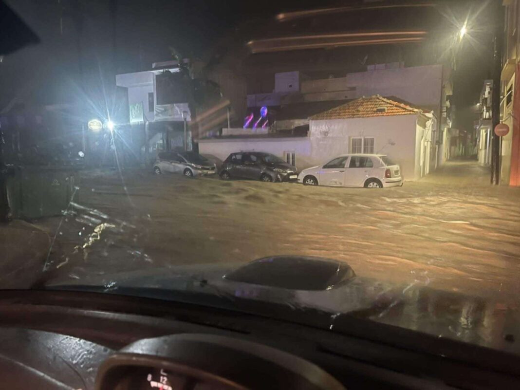 Η στάθμη του νερού στους δρόμους έχει φτάσει σε ανησυχητικά επίπεδα, καλύπτοντας ήδη τις ρόδες των παρκαρισμένων οχημάτων, ενώ παράλληλα η περιοχή έχει βυθιστεί στο σκοτάδι εξαιτίας της διακοπής του δημοτικού φωτισμού.