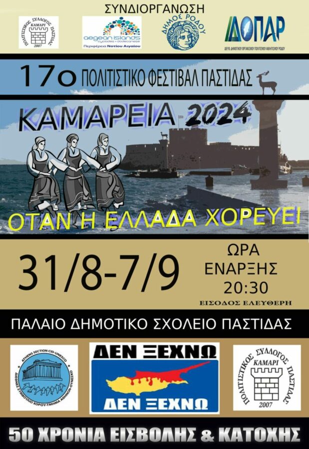 Ο Πολιτιστικός Σύλλογος Παστίδας Ρόδου «Καμάρι» σας προσκαλεί στο 17ο Πολιτιστικό Φεστιβάλ Παστίδας «Καμάρεια 2024» που συνδιοργανώνει με την Περιφέρεια Νοτίου Αιγαίου και τον Δήμο Ρόδου – Δ.Ο.Π.Α.Ρ.