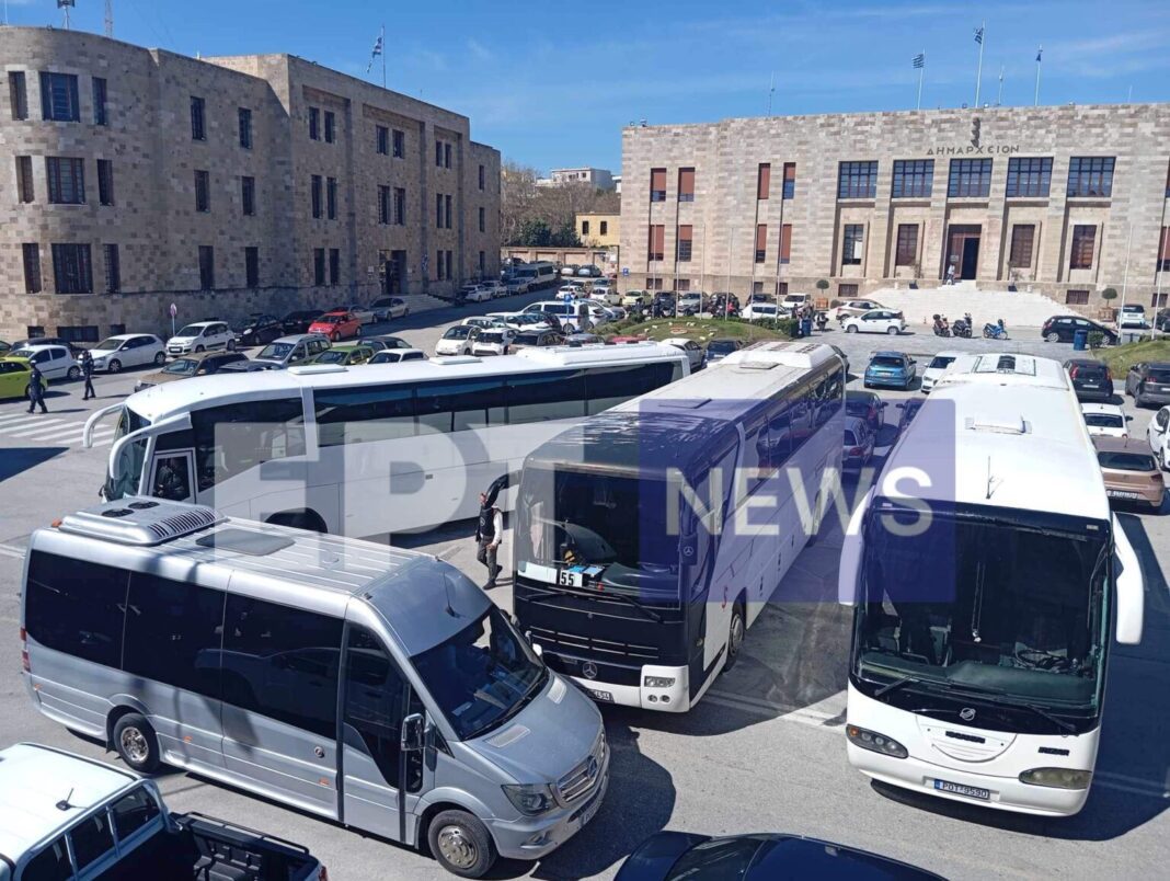 Οι οδηγοί και οι ιδιοκτήτες των τουριστικών λεωφορείων συγκεντρώθηκαν στις 09:00 η ώρα στο τουριστικό λιμάνι της Ρόδου, για να κατευθυνθούν με τα πούλμαν τους, συνοδευόμενοι από αστυνομικούς της τροχαίας, στην πλατεία δημαρχείου.