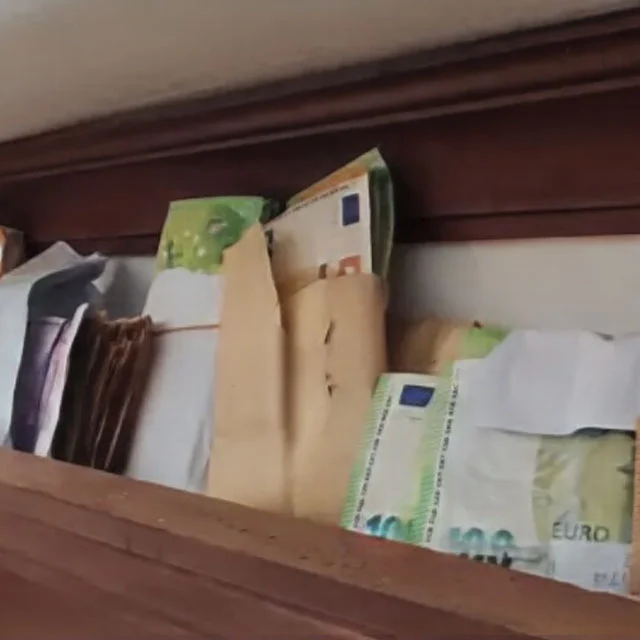 Στο σαλόνι, μέσα σε έπιπλο κρυσταλλιέρα, 62.000 ευρώ, ενώ σε άλλο σημείο του ίδιου χώρου εντοπίστηκαν ακόμη 21.000 ευρώ.