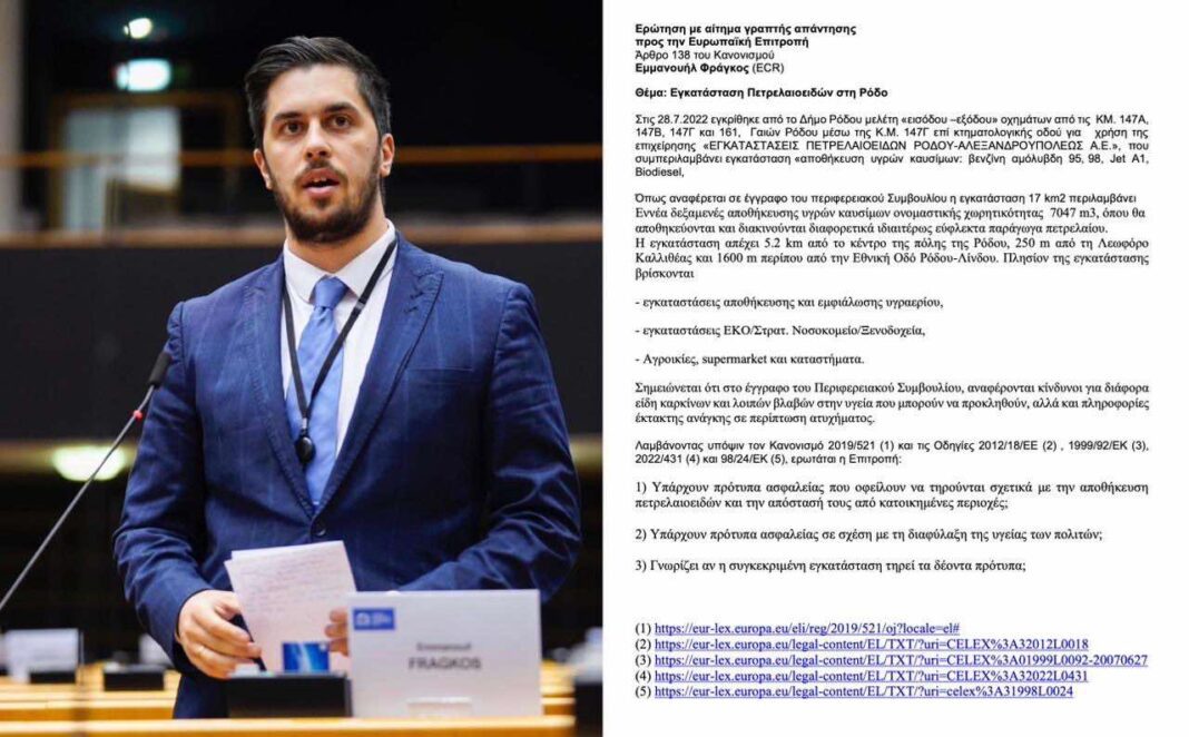Ο ευρωβουλευτής αναρωτιέται με ερώτηση του προς την Επιτροπή: τηρούνται τα αυστηρά πρότυπα ασφαλείας που προβλέπουν οι ευρωπαϊκές οδηγίες, ή οι κάτοικοι της περιοχής ζουν με τον κίνδυνο της καταστροφής να τους χτυπά την πόρτα κάθε μέρα; Οι Κανονισμοί 2019/521, οι Οδηγίες 2012/18/ΕΕ, 1999/92/ΕΚ και άλλες σχετικές ρυθμίσεις απαιτούν από τέτοιου είδους εγκαταστάσεις να βρίσκονται σε ασφαλείς αποστάσεις από κατοικίες και εμπορικές ζώνες, ακριβώς για να αποτρέψουν ατυχήματα που μπορεί να καταλήξουν σε τραγωδία. Ωστόσο, οι διαμαρτυρίες των κατοίκων αφήνουν να εννοηθεί πως η κατάσταση στη Ρόδο απέχει πολύ από το ιδανικό.