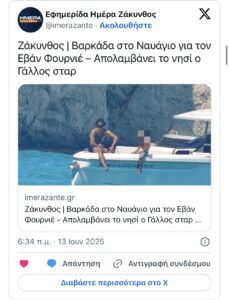 Όπως είχε προαναγγείλει ο Εβάν Φουρνιέ θα περνούσε το πρώτο μέρος των καλοκαιρινών του διακοπών στην όμορφη Ζάκυνθο.