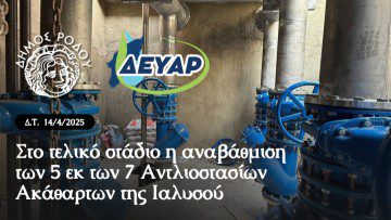 O Δήμος Ρόδου και η ΔΕΥΑΡ προχωρούν με ταχύτητα και υπευθυνότητα στην υλοποίηση του στρατηγικού της σχεδιασμού, ολοκληρώνοντας το έργο αναβάθμισης πέντε εκ των επτά αντλιοστασίων ακαθάρτων της Ιαλυσού.