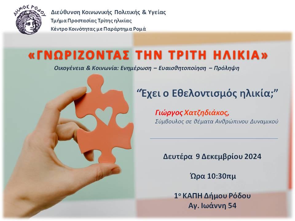 Η επόμενη διάλεξη, που είναι ανοιχτή για το κοινό, με τίτλο «Έχει ο Εθελοντισμός ηλικία;» θα πραγματοποιηθεί τη Δευτέρα 9 Δεκεμβρίου 2024 στο χώρο του ΚΑΠΗ (Αγ. Ιωάννη 54) και ώρα 10:30πμ με ομιλητή τον κ. Γιώργο Χατζηδιάκο, Σύμβουλο σε θέματα Ανθρώπινου Δυναμικού.