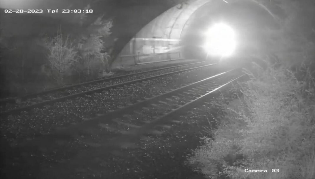 Στιγμιότυπο από τη στιγμή που η εμπορική αμαξοστοιχία διέρχεται από τη σήραγγα
