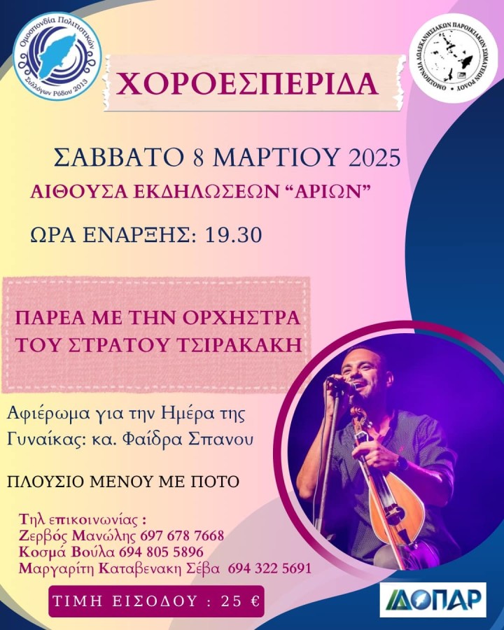 Η Ομοσπονδία Πολιτιστικών Συλλόγων Ρόδου διοργανώνει Χοροεσπερίδα το Σάββατο 8 Μαρτίου 2025, στις 19:30, στην Αίθουσα Εκδηλώσεων «Αρίων».
