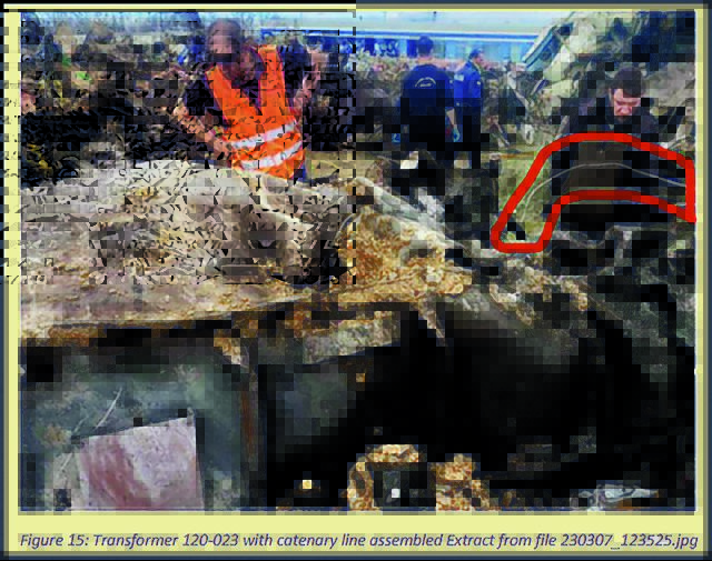 Το τελευταίο χρονικό διάστημα υπάρχει εστίαση των οικείων των θυμάτων στο οπτικό υλικό που συνοδεύει την προαναφερόμενη έκθεση της εταιρείας διαχείρισης των τρένων και ειδικά εκεί όπου φαίνεται ένα καλώδιο του δικτύου του ΟΣΕ να έχει εισέλθει σε έναν από τους μετασχηματιστές. Ο Κώστας Λακαφώσης, ένας από τους κύριους τεχνικούς πραγματογνώμονες που έχουν διορίσει οικογένειες θυμάτων των Τεμπών, σημειώνει ότι «αυτές οι φωτογραφίες είναι πλαστογραφημένες, σκηνοθετημένες. Κάποιοι έβαλαν εκεί το καλώδιο για να πουν μετά ότι το καλώδιο προκάλεσε την έκρηξη και τη φωτιά στον μετασχηματιστή. Κάποιος πήγε και ακούμπησε εκεί το καλώδιο, δεν είναι η θέση του εκεί. Είναι ξεκάθαρο. Υπάρχουν δέκα διαφορετικές τεχνικές εκθέσες και φωτογραφίες από τον χώρο που δείχνουν τι συνέβη κι όπου δεν φαίνεται πουθενά αυτή η σύνδεση καλωδίου μετασχηματιστή».