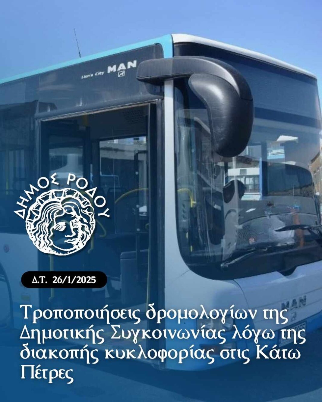 Ο Δήμος Ρόδου ενημερώνει τους επιβάτες της Δημοτικής Συγκοινωνίας ότι, λόγω της διακοπής κυκλοφορίας στην Επαρχιακή Οδό Ρόδου-Καμείρου από το 1ο χιλιόμετρο (συμβολή με οδό Παπαλουκά) έως το 2ο χιλιόμετρο (περιοχή Κάτω Πέτρες) και στα δύο ρεύματα κυκλοφορίας, που είναι σε ισχύ από τις 06:00 το πρωί σήμερα Κυριακή 26 Ιανουαρίου 2025 έως τις 09:00 το πρωί της Τετάρτης 29 Ιανουαρίου 2025, λόγω ελέγχου και αποκατάστασης στα πρανή του Λόφου Ακρόπολης και της περιοχής Κάτω Πέτρες, τα δρομολόγια των λεωφορείων για το χρονικό διάστημα αυτό διαμορφώνονται ως εξής: