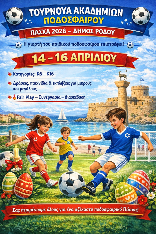 Η Διεύθυνση Αθλητισμού του Δήμου Ρόδου διοργανώνει το 33ο Τουρνουά Ακαδημιών Ποδοσφαίρου – Πάσχα 2026, το οποίο θα διεξαχθεί από τις 14 έως τις 17 Απριλίου 2026. Οι αγώνες θα πραγματοποιηθούν στα γήπεδα των Αγίων Αποστόλων και της Διμυλιάς, με τη συμμετοχή ακαδημιών ποδοσφαίρου και αθλητικών συλλόγων από τα Δωδεκάνησα.