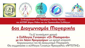 Για 6η συνεχόμενη χρονιά ο Σύλλογος Γυναικών «Οι Μασαρενές» με τη Λέσχη Αρχιμαγείρων ως Κριτική Επιτροπή διοργανώνουν τον 6ο Διαγωνισμό Μαγειρικής. Θα συμμετάσχει ο Σύλλογος Γυναικών Αρχαγγέλου «Άρτεμις» και η Αδελφότητα Ολυμπιτών Ρόδου «Η Βρύκους» θα παρουσιάσουν πώς φτιάχνονται οι παραδοσιακές τους μακαρούνες.