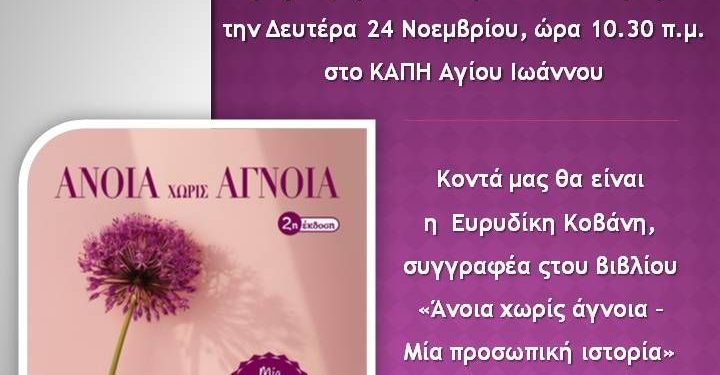 Το ΚΑΠΗ Δήμου Ρόδου διοργανώνει τη Δευτέρα 24 Νοεμβρίου, στις 10:30π.μ. ανοιχτή συζήτηση με αφορμή το βιβλίο της Ευρυδίκης Κοβάνη «Άνοια χωρίς άγνοια – Μια προσωπική ιστορία», ένα εγχειρίδιο γραμμένο για οικογενειακούς φροντιστές ατόμων με άνοια.