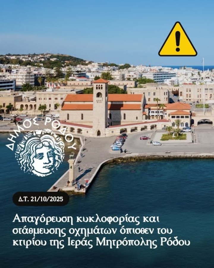 Ο Δήμος Ρόδου ενημερώνει ότι, σύμφωνα με ανακοίνωση της Γενικής Περιφερειακής Αστυνομικής Διεύθυνσης Νοτίου Αιγαίου, δεν επιτρέπεται η κυκλοφορία και η στάθμευση οχημάτων στην Πλατεία Αντιναυάρχου Περικλή Ιωαννίδη, στο τμήμα από το Βωμό της Πατρίδος έως και τον Ιερό Ναό του Ευαγγελισμού, στην πλευρά που βρίσκεται πίσω από το κτίριο της Ιεράς Μητρόπολης Ρόδου.