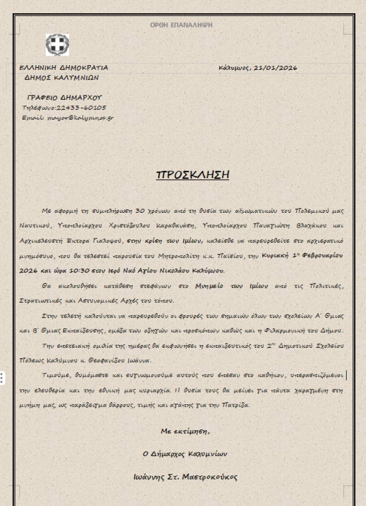 Ο Δήμος Καλυμνίων με αφορμή τη συμπλήρωση τριάντα χρόνων από τη θυσία των 3 αξιωματικών του Πολεμικού Ναυτικού που έπεσαν στο καθήκον κατά την κρίση των Ιμίων, αποτίει φόρο τιμής στη μνήμη τους.