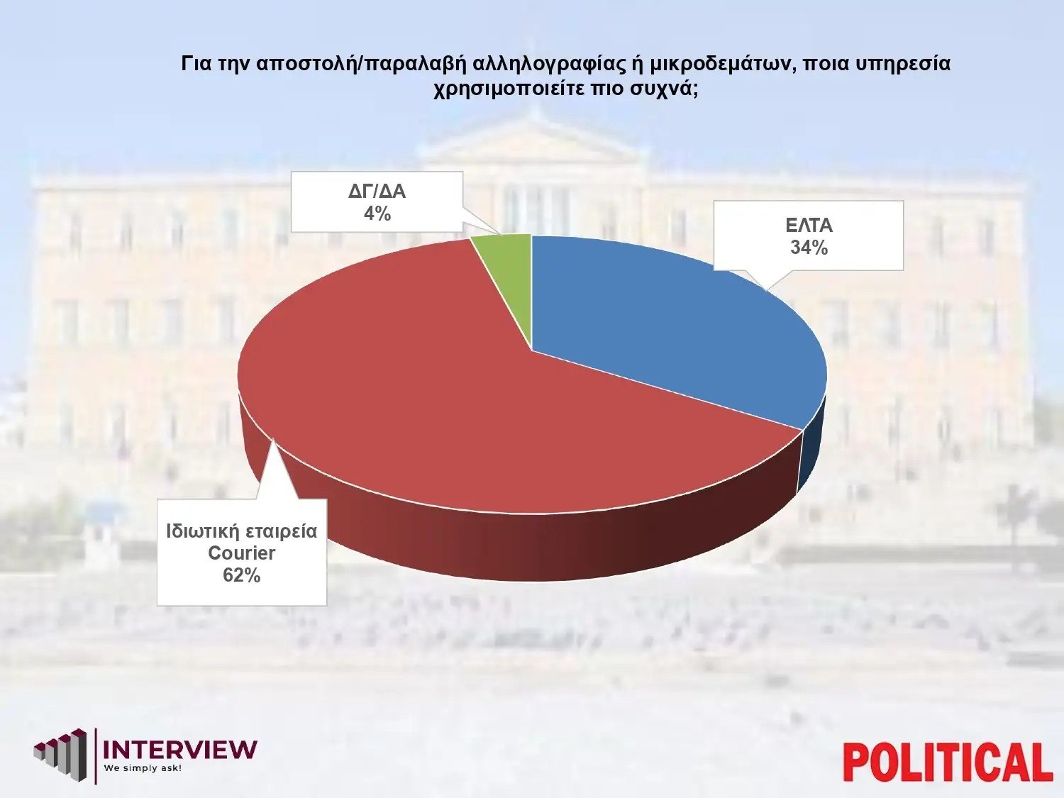 Το 62% απαντά ότι χρησιμοποιεί πιο συχνά τις ιδιωτικές εταιρείες courier για αποστολή – παραλαβή αλληλογραφίας ή μικροδεμάτων, έναντι 34% που επιλέγει τα ΕΛΤΑ.