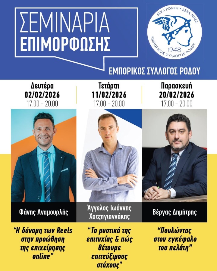 Ο Εμπορικός Σύλλογος Ρόδου διοργανώνει για τον Φεβρουάριο τρία δωρεάν επιμορφωτικά σεμινάρια, τα οποία θα καλύψουν σημαντικά θέματα για τους επαγγελματίες και τους επιχειρηματίες της περιοχής. Οι συμμετέχοντες θα έχουν την ευκαιρία να παρακολουθήσουν εξειδικευμένα θέματα από κορυφαίους εισηγητές του χώρου, όπως οι στρατηγικές προώθησης μέσω Social Media, η θέσπιση επιτεύξιμων στόχων και η επιστήμη πίσω από τις πωλήσεις. Τα σεμινάρια, τα οποία θα διαρκούν τρεις ώρες, απευθύνονται σε επαγγελματίες, επιχειρηματίες και το ευρύ κοινό, ενώ οι θέσεις είναι περιορισμένες και απαιτείται δήλωση συμμετοχής.