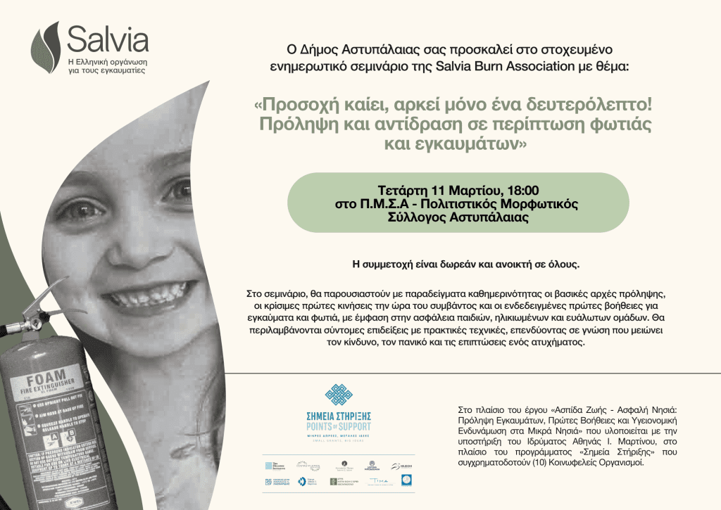 Στην Αστυπάλαια θα πραγματοποιηθεί την Τετάρτη 11 Μαρτίου στις 18:00 στο Πολιτιστικό Μορφωτικό Σύλλογο Αστυπάλαιας σεμινάριο με τίτλο «Προσοχή καίει, αρκεί μόνο ένα δευτερόλεπτο! Πρόληψη και αντίδραση σε περίπτωση φωτιάς και εγκαυμάτων».