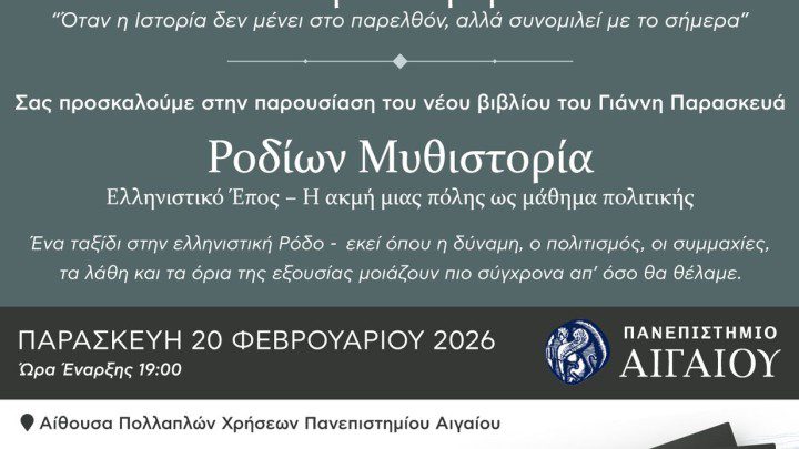 Την Παρασκευή 20 Φεβρουαρίου, στις 19:00, θα παρουσιαστεί στην αίθουσα εκδηλώσεων του Πανεπιστήμιο Αιγαίου το νέο βιβλίο του Γιάννης Παρασκευάς με τίτλο «Ροδίων Μυθιστορία».
