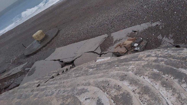 Αντίστοιχη εικόνα καταγράφεται και στην παραλία κοντά στο Ενυδρείο, όπου τσιμεντένια σκάλα που οδηγεί στη θάλασσα αποκολλήθηκε από τον κυρίως χώρο της πλατείας, εξαιτίας της υποσκαφής που δημιούργησαν τα κύματα στην άμμο. Η κατασκευή έχει πλέον αποκοπεί πλήρως και στέκει στον αέρα, αφήνοντας επικίνδυνο κενό.