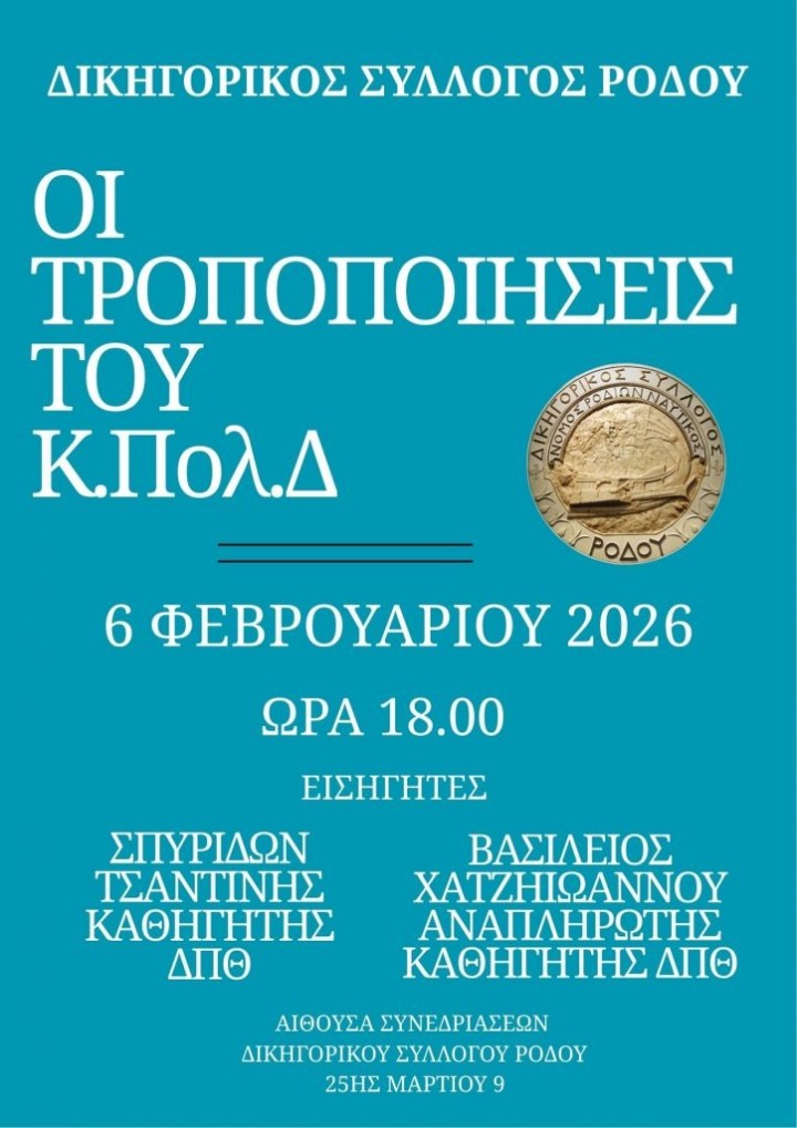 Ο Δικηγορικός Σύλλογος Ρόδου διοργανώνει σήμερα, Παρασκευή 6 Φεβρουαρίου 2026, Επιστημονική Ημερίδα με θέμα: «Οι Τροποποιήσεις του Κώδικα Πολιτικής Δικονομίας (Κ.Πολ.Δ.)».