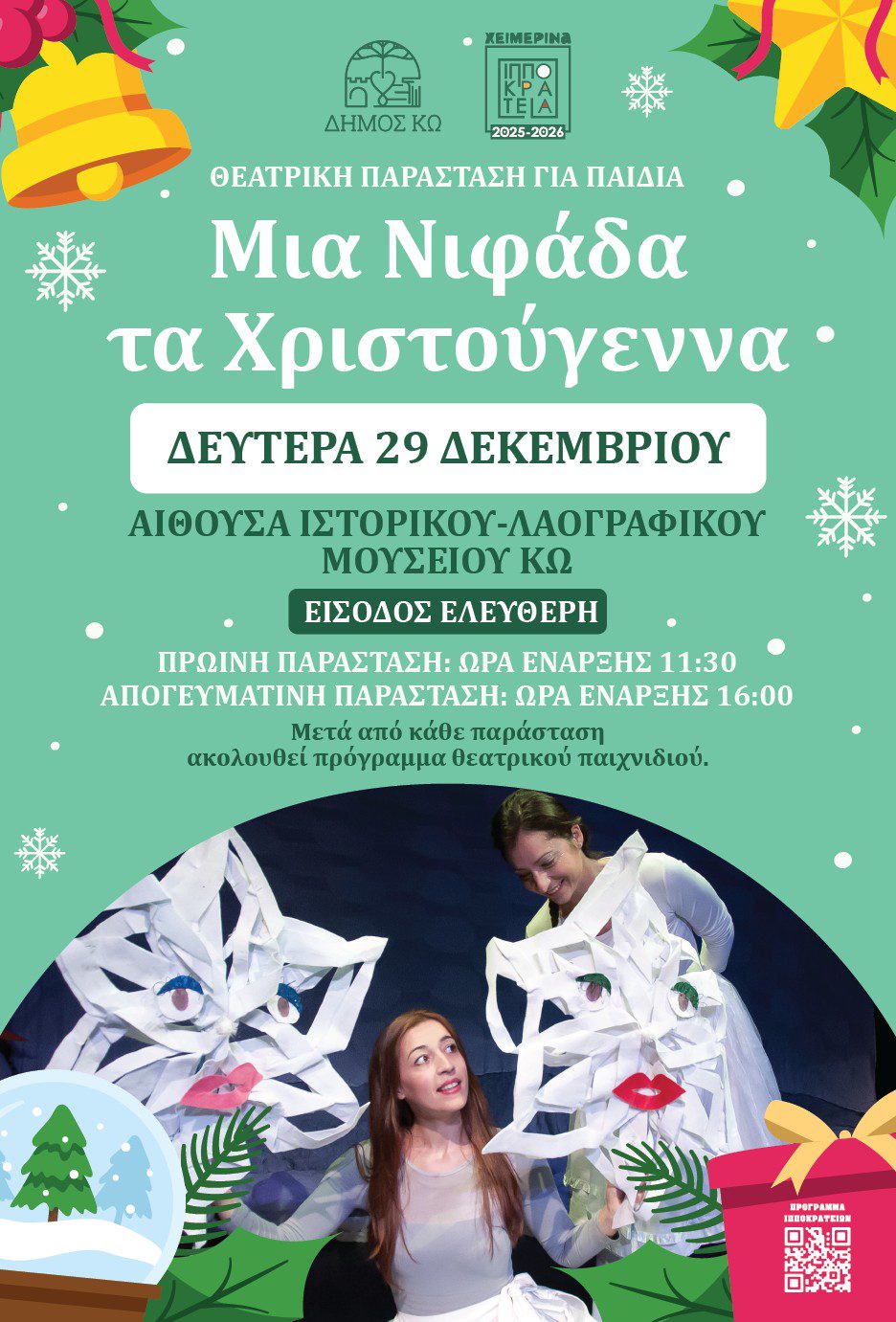 Στο πλαίσιο των Χειμερινών Πολιτιστικών Εκδηλώσεων «Ιπποκράτεια 2025-26», ο Δήμος Κω παρουσιάζει τη θεατρική παράσταση για παιδιά «Μια νιφάδα τα Χριστούγεννα», με ελεύθερη είσοδο.