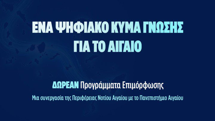 Νέος κύκλος δωρεάν επιμορφωτικών προγραμμάτων ξεκινά στο Νότιο Αιγαίο μέσα από τη συνεργασία της Περιφέρεια Νοτίου Αιγαίου και του Πανεπιστήμιο Αιγαίου, στο πλαίσιο της δράσης Aegean Skills, με στόχο την ενίσχυση της δια βίου μάθησης και την καλλιέργεια σύγχρονων επαγγελματικών δεξιοτήτων.